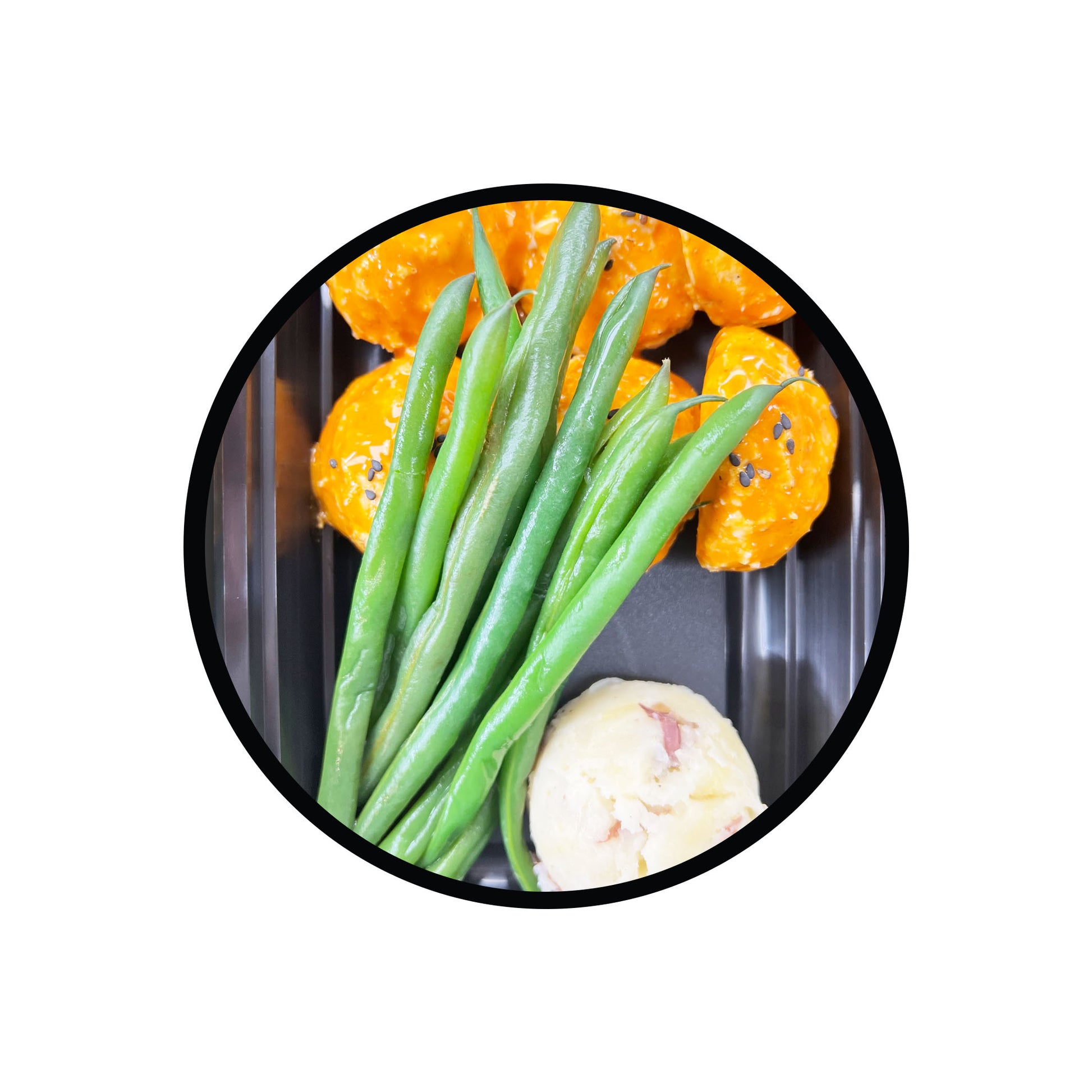 Juicy chicken meatballs with a spicy buffalo kick, paired with creamy mashed potatoes and crisp green beans. Bold, satisfying, and full of character—this plate packs heat and harmony. If spice isn’t your thing, swap in teriyaki sauce for a gentler, sweet-savory vibe.